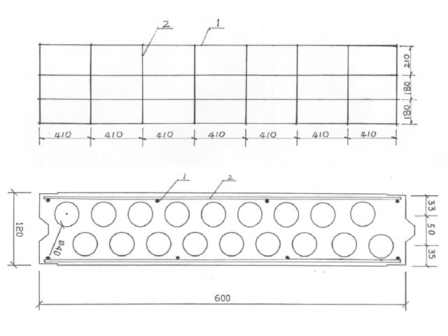 以我公司生產(chǎn)的厚度120mm板(寬度600mm,長(zhǎng)度2900mm)為例,鋼絲網(wǎng)用縱向鋼筋4根、橫向箍筋8根焊接而成。要正確設(shè)置縱向鋼筋的位置,4根縱向鋼絲不是等距離的,間距分別為210mm、180mm和180mm,使之盡量嵌于兩個(gè)圓形芯孔的中間位置附近,從而避開芯孔邊緣面層的最薄端。這樣鋼絲的內(nèi)外保護(hù)層可以顯著增大,而對(duì)橫向箍筋的布設(shè)沒(méi)有限制,均勻布設(shè)即可。